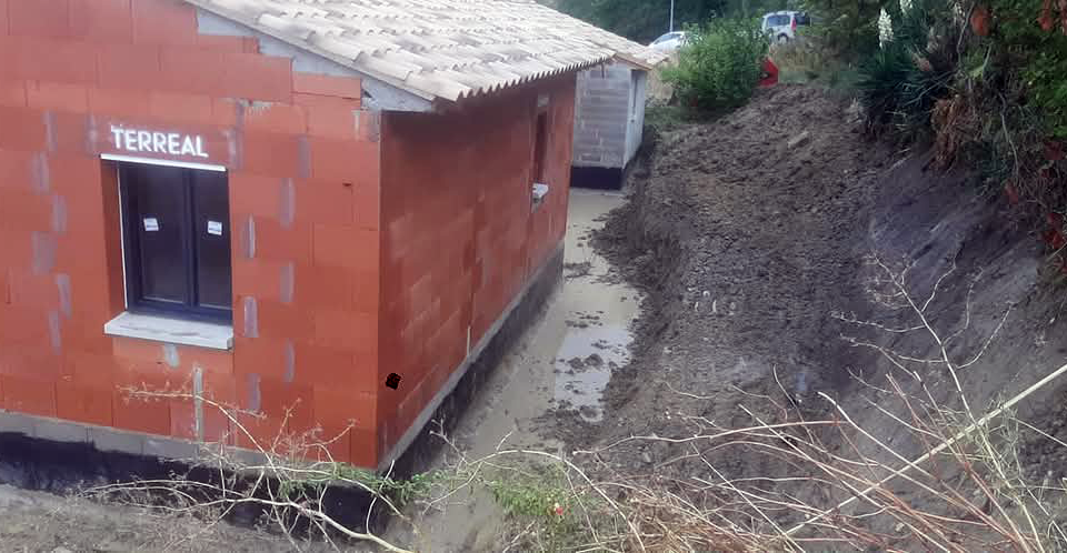 Ensuite, démolition du mur en parpaing qui menaçait de tomber. Il était poussé par la terre et la chaussée au dessus présentait un risque d’effondrement.