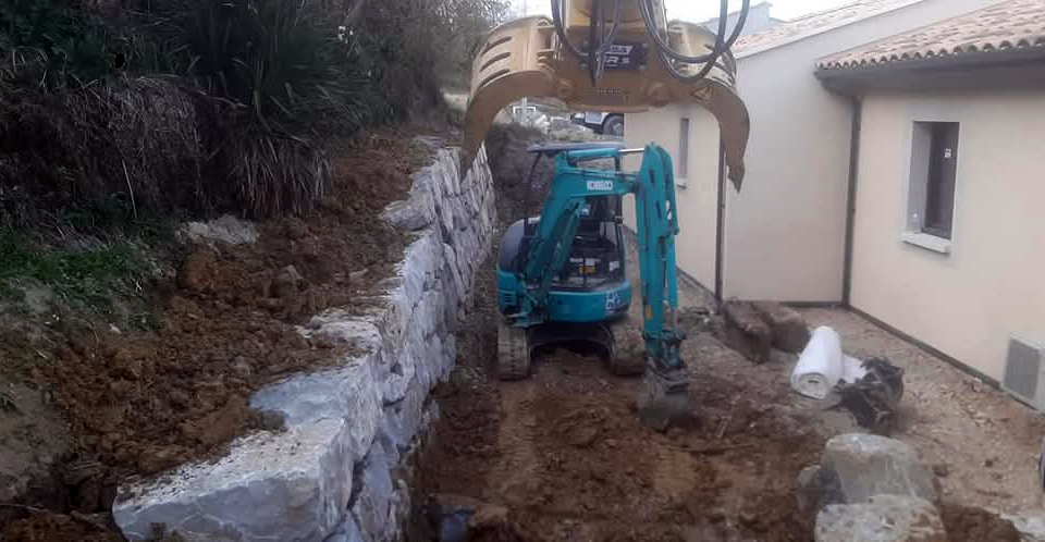 Terrassement et enrochement du talus à l’arrière d’une maison avec des roches issues de la vallée de l’Ennuye à Aubres. Suivi du drainage d’une source et d’un aménagement d’un réseau des eaux pluviales.