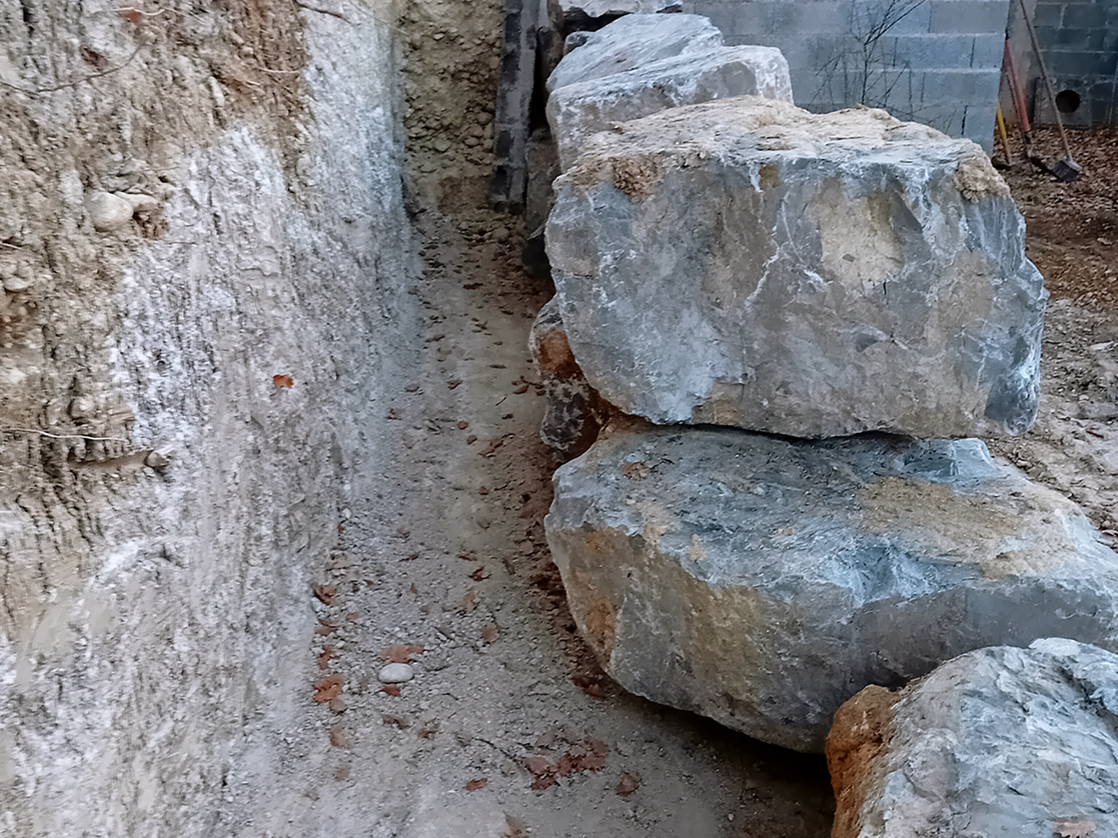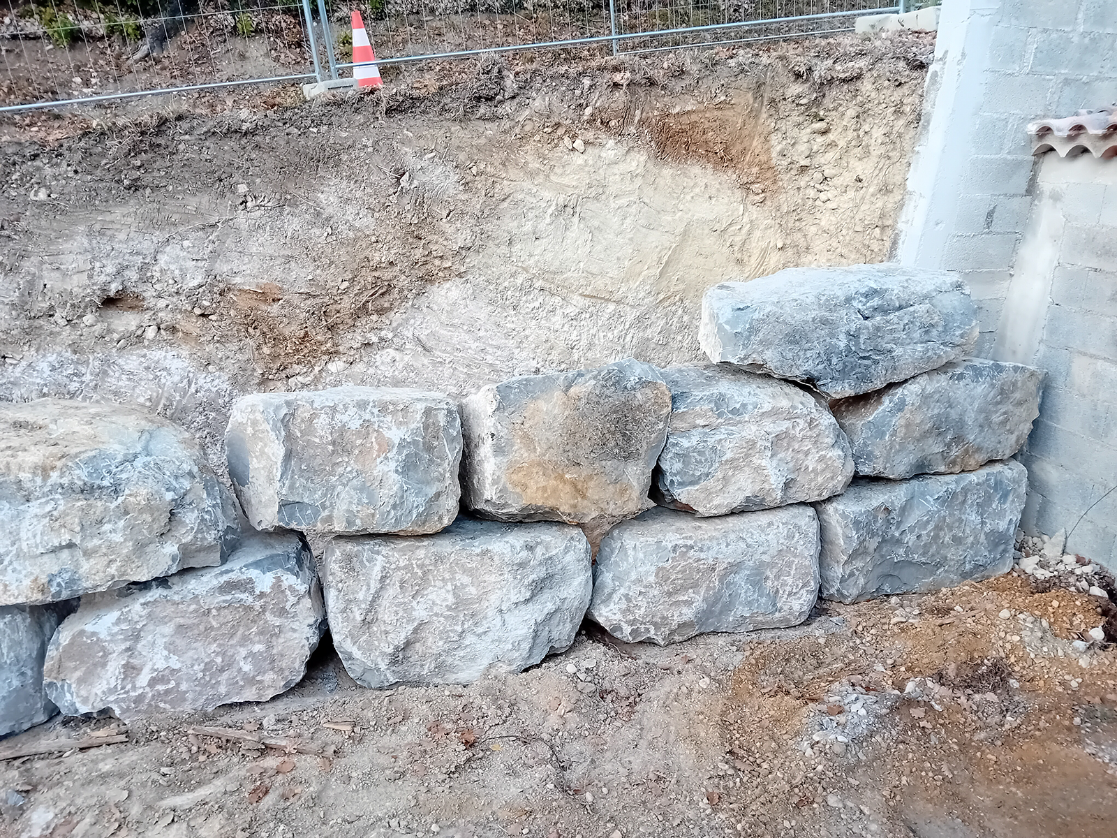 Destruction et remplacement d’un mur en parpaing défaillant par un enrochement de soutènement.