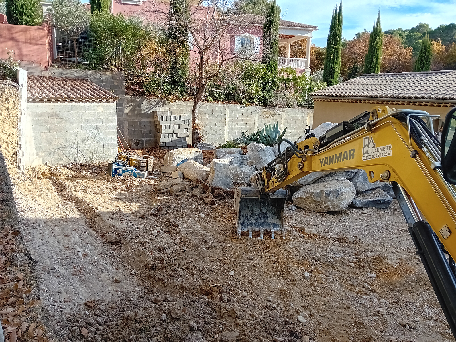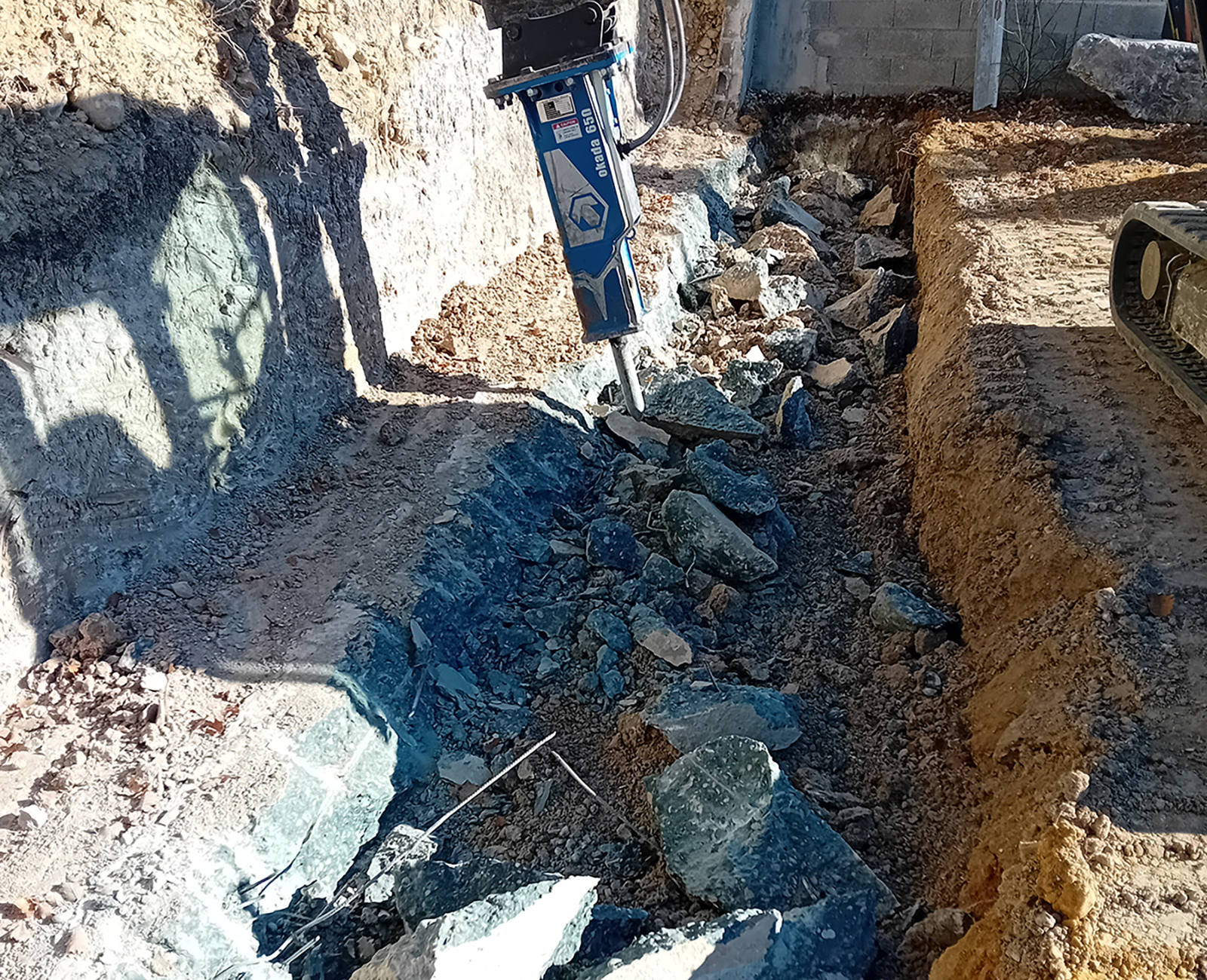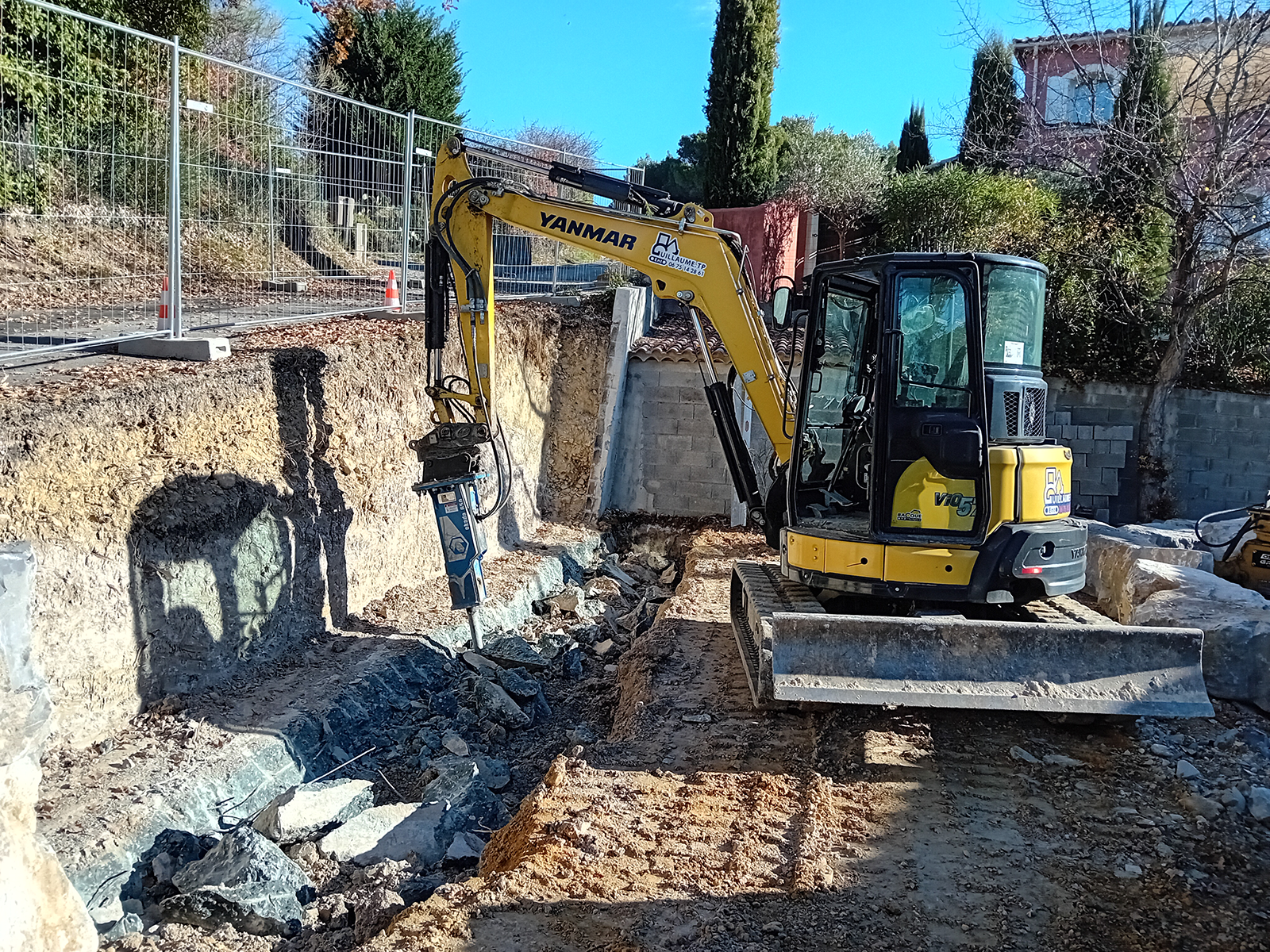- Mini-pelle équipée d’un brise roche hydraulique pour mettre en morceaux l’ancienne piscine.