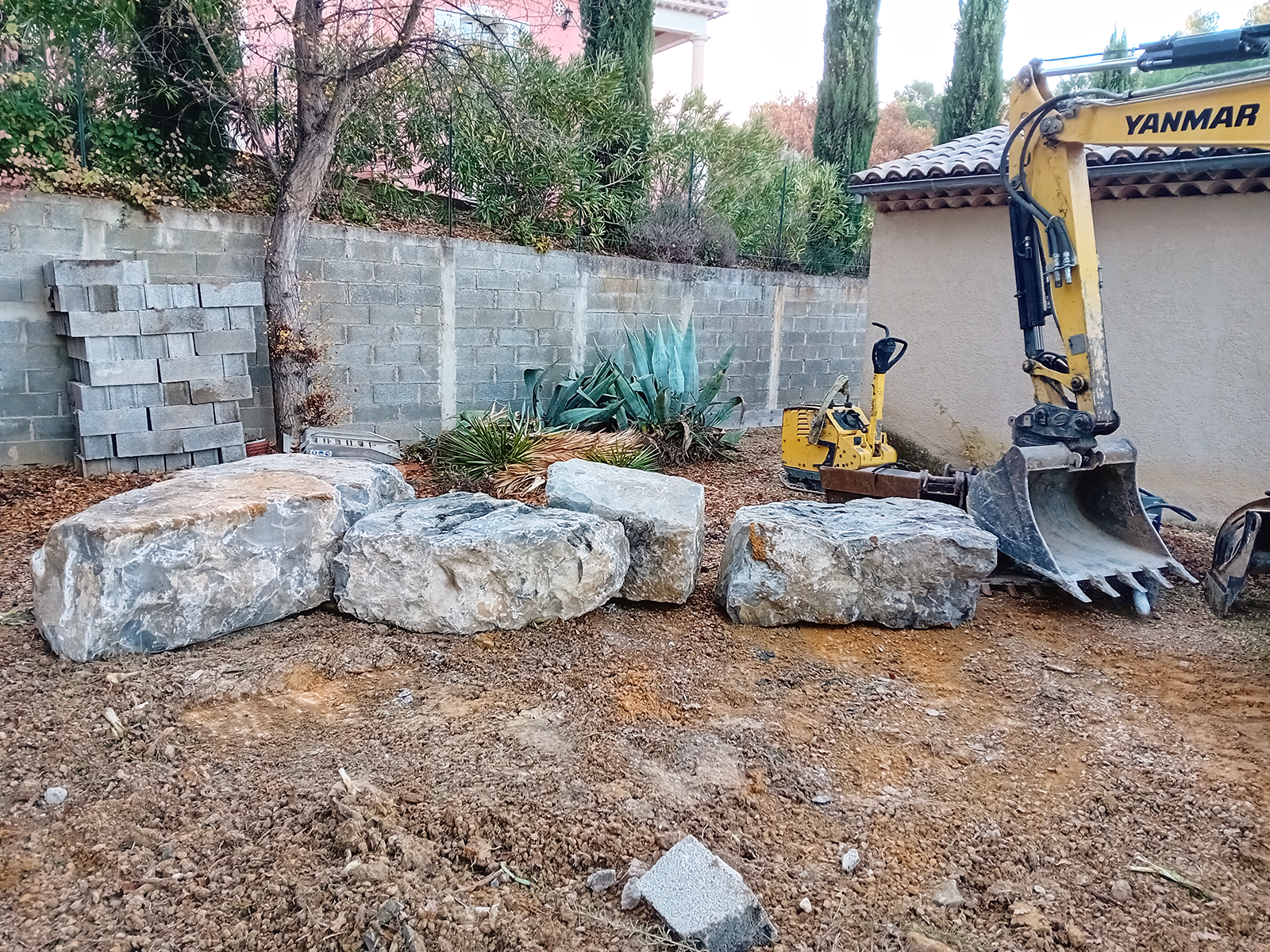 L’enrochement est réalisé avec des pierres de couleur beige d’ézahut pour l’aménagement du devant de la maison. 300 Tonnes de rochers ont été nécessaire à la réalisation de ces aménagements.